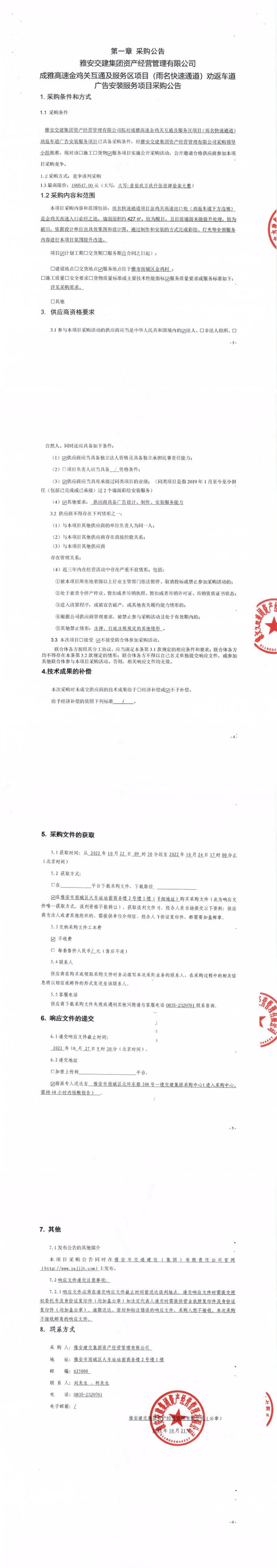 雅安交建集團資產(chǎn)經(jīng)營管理有限公司成雅高速金雞關(guān)互通及服務(wù)區(qū)項目(雨名快速通道)勸返車道廣告安裝服務(wù)項目采購公告