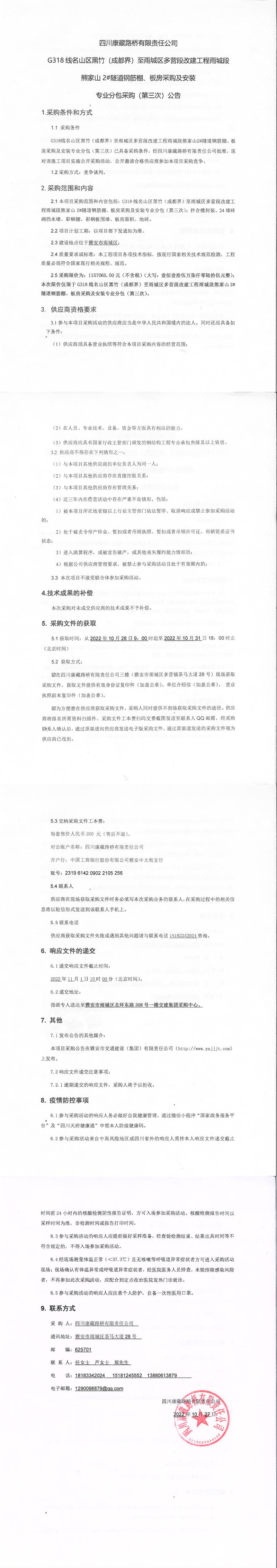 四川康藏路橋有限責(zé)任公司G318線名山區(qū)黑竹(成都界)至雨城區(qū)多營(yíng)段改建工程雨城段熊家山2#隧道鋼筋棚、板房采購(gòu)及安裝專業(yè)分包采購(gòu)(第三次)公告