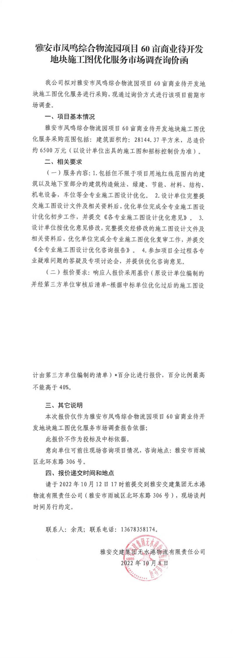 雅安交建集團(tuán)無水港物流有限責(zé)任公司雅安市鳳鳴綜合物流園項(xiàng)目60畝商業(yè)待開發(fā)地塊施工圖優(yōu)化服務(wù)市場(chǎng)調(diào)查詢價(jià)函