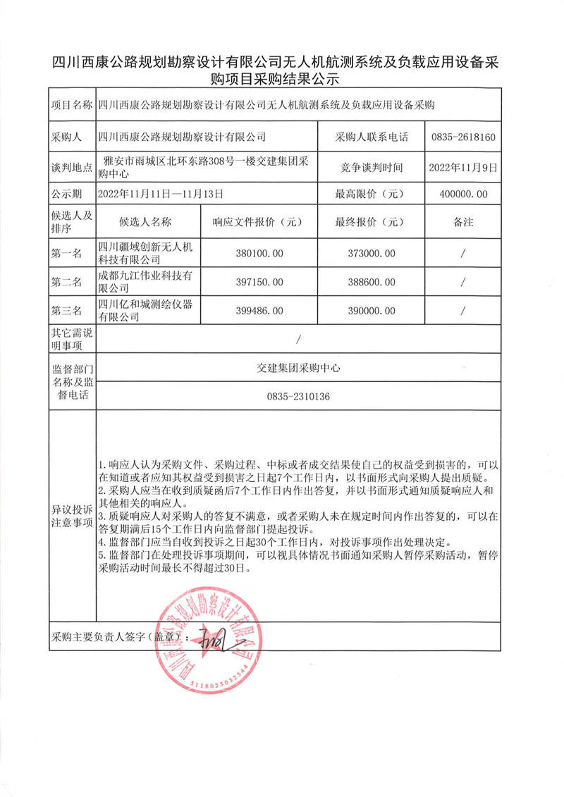 四川西康公路規(guī)劃勘察設(shè)計(jì)有限公司無人機(jī)航測(cè)系統(tǒng)及負(fù)載應(yīng)用設(shè)備采購項(xiàng)目采購結(jié)果公示