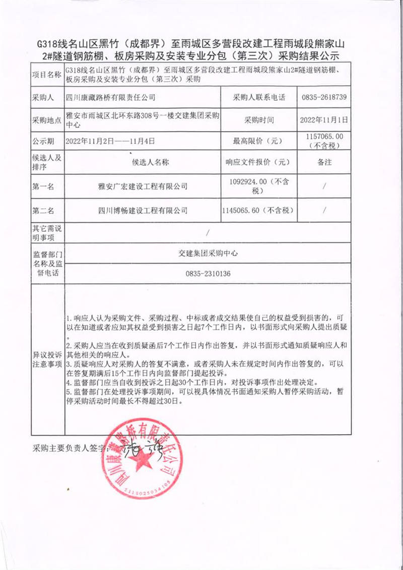 四川康藏路橋有限責任公司G318線名山區(qū)黑竹(成都界)至雨城區(qū)多營段改建工程雨城段熊家山2#隧道鋼筋棚、板房采購及安裝專業(yè)分包(第三次)采購結(jié)果公示