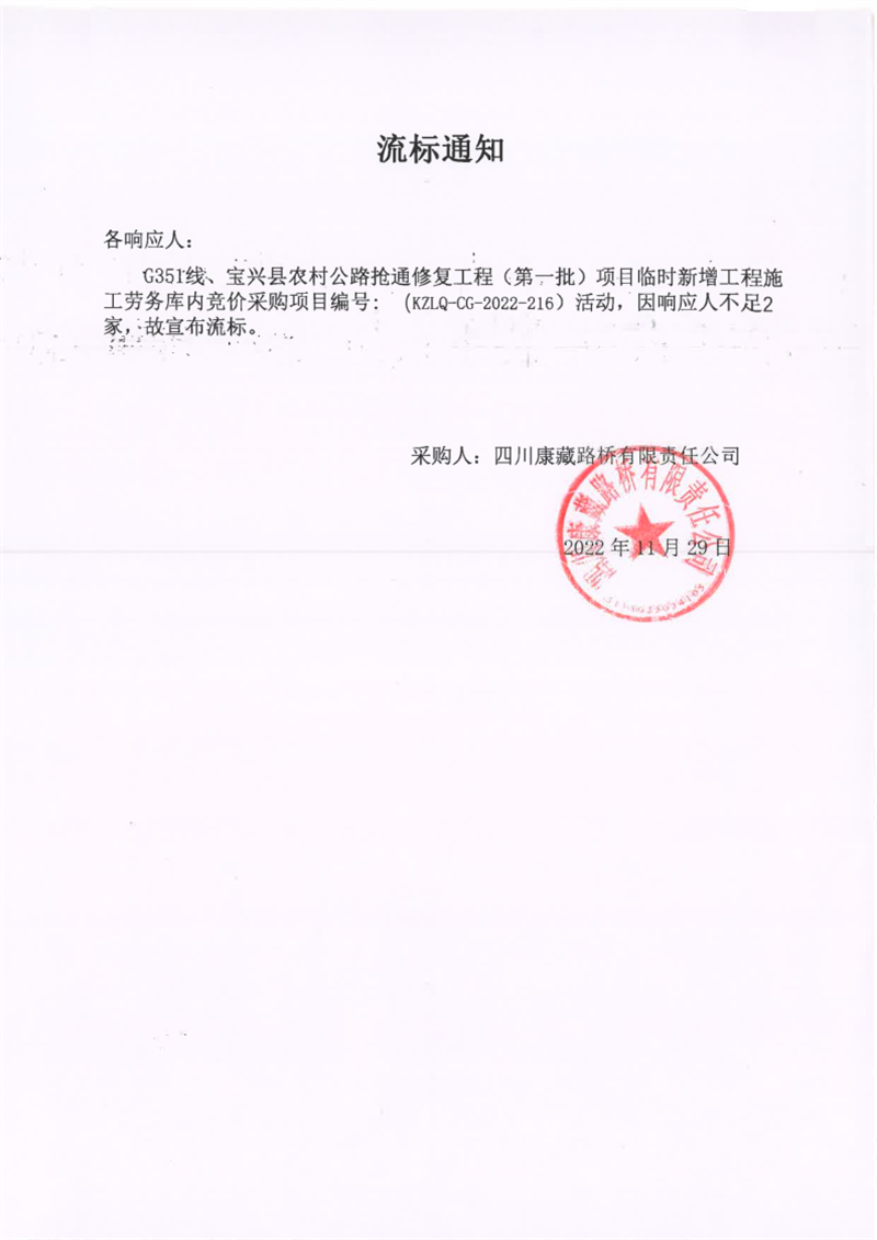四川康藏路橋有限責(zé)任公司G351線、寶興縣農(nóng)村公路搶通修復(fù)工程(第一批)項目臨時新增工程施工勞務(wù)庫內(nèi)競價采購流標(biāo)通知
