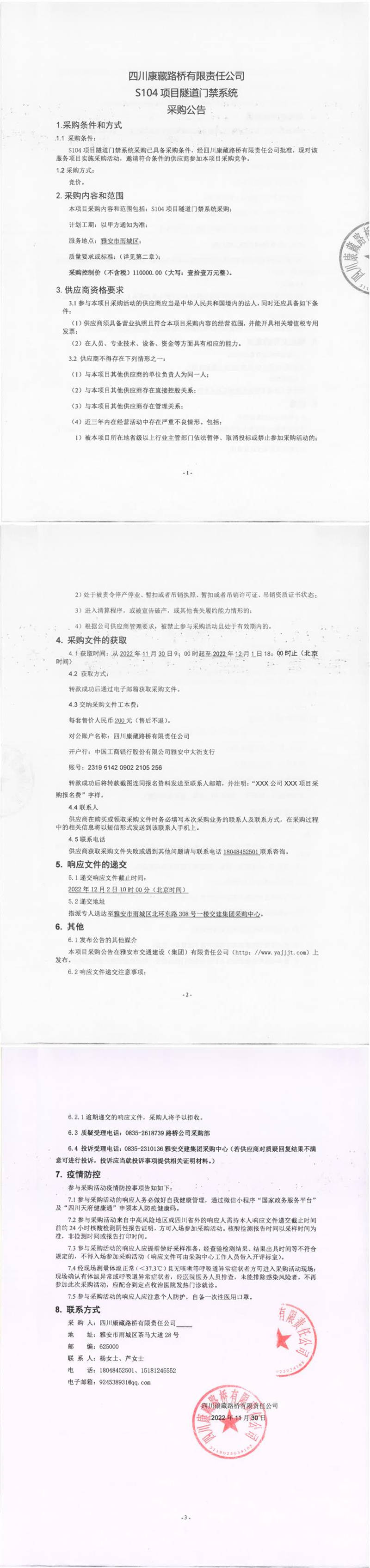 四川康藏路橋有限責(zé)任公司S104項目隧道門禁系統(tǒng)采購公告