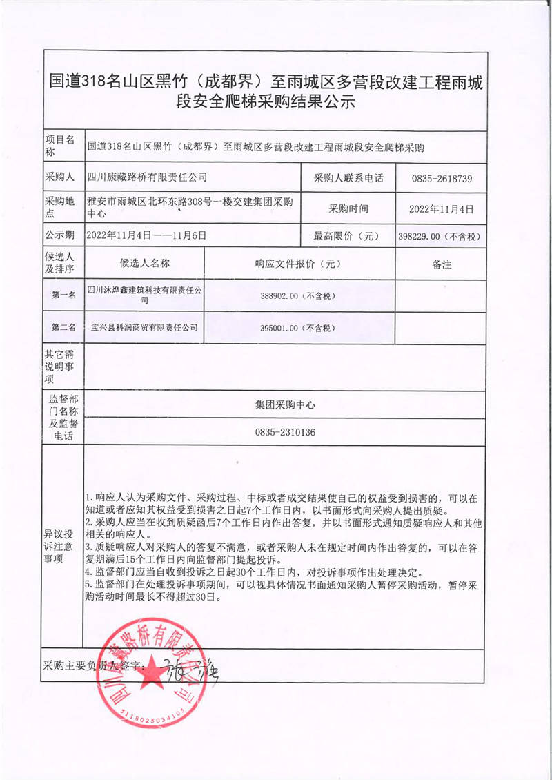 四川康藏路橋有限責(zé)任公司國道318名山區(qū)黑竹(成都界)至雨城區(qū)多營段改建工程雨城段安全爬梯采購結(jié)果公示