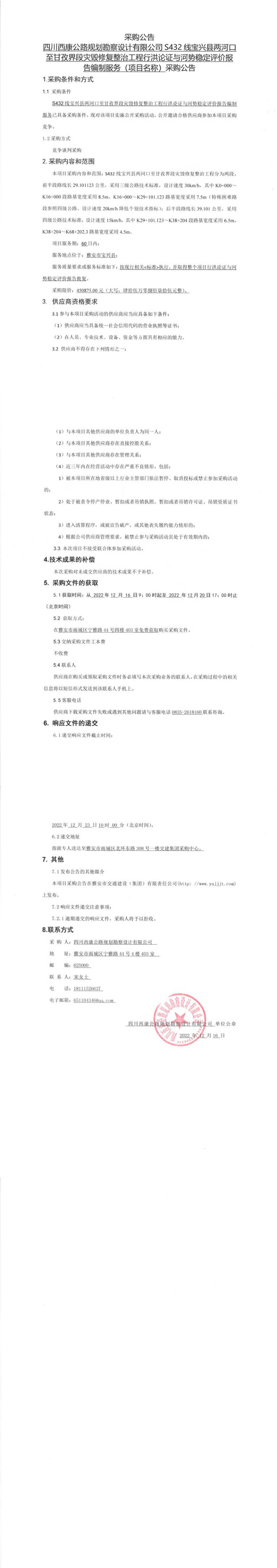 四川西康公路規(guī)劃勘察設(shè)計(jì)有限公司S432線(xiàn)寶興縣兩河口至甘孜界段災(zāi)毀修復(fù)整治工程行洪論證與河勢(shì)穩(wěn)定評(píng)價(jià)報(bào)告編制服務(wù)(項(xiàng)目名稱(chēng))采購(gòu)公告