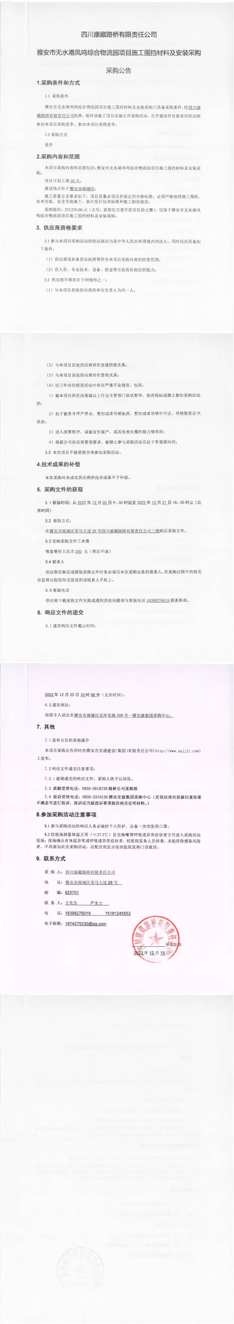 四川康藏路橋有限責任公司雅安市無水港鳳鳴綜合物流園項目施工圍擋材料及安裝采購采購公告