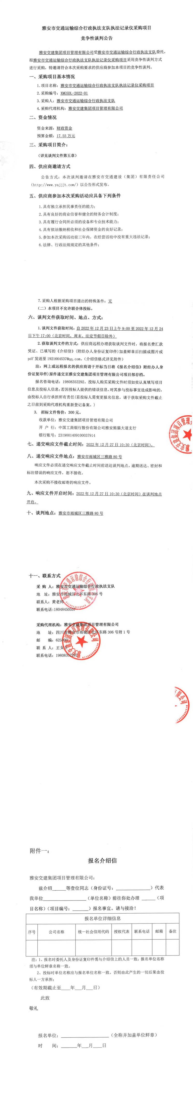 雅安交建集團項目管理有限公司雅安市交通運輸綜合行政執(zhí)法支隊執(zhí)法記錄儀采購項目競爭性談判公告
