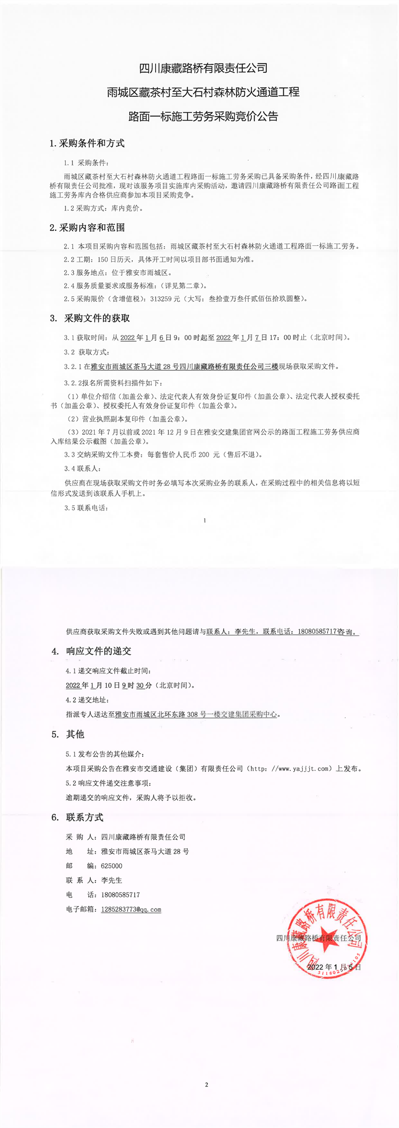四川康藏路橋有限責任公司雨城區(qū)藏茶村至大石村森林防火通道工程路面一標施工勞務(wù)采購競價公告