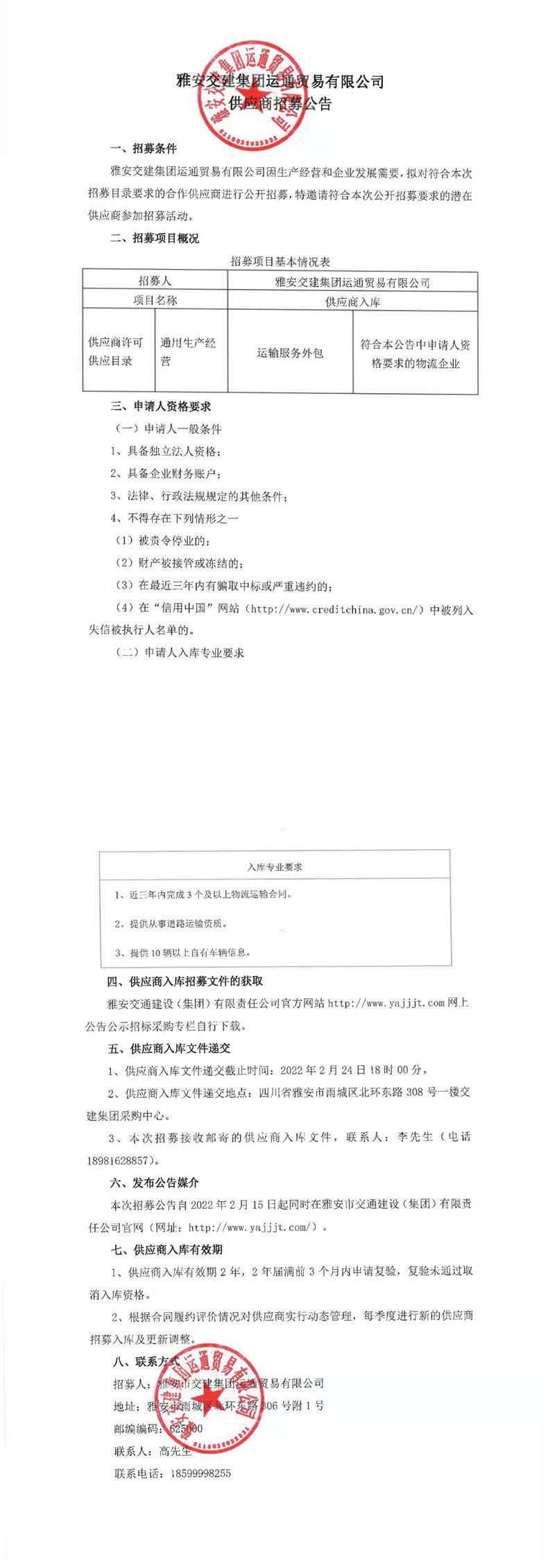 雅安交建集團運通貿(mào)易有限公司供應商招募公告