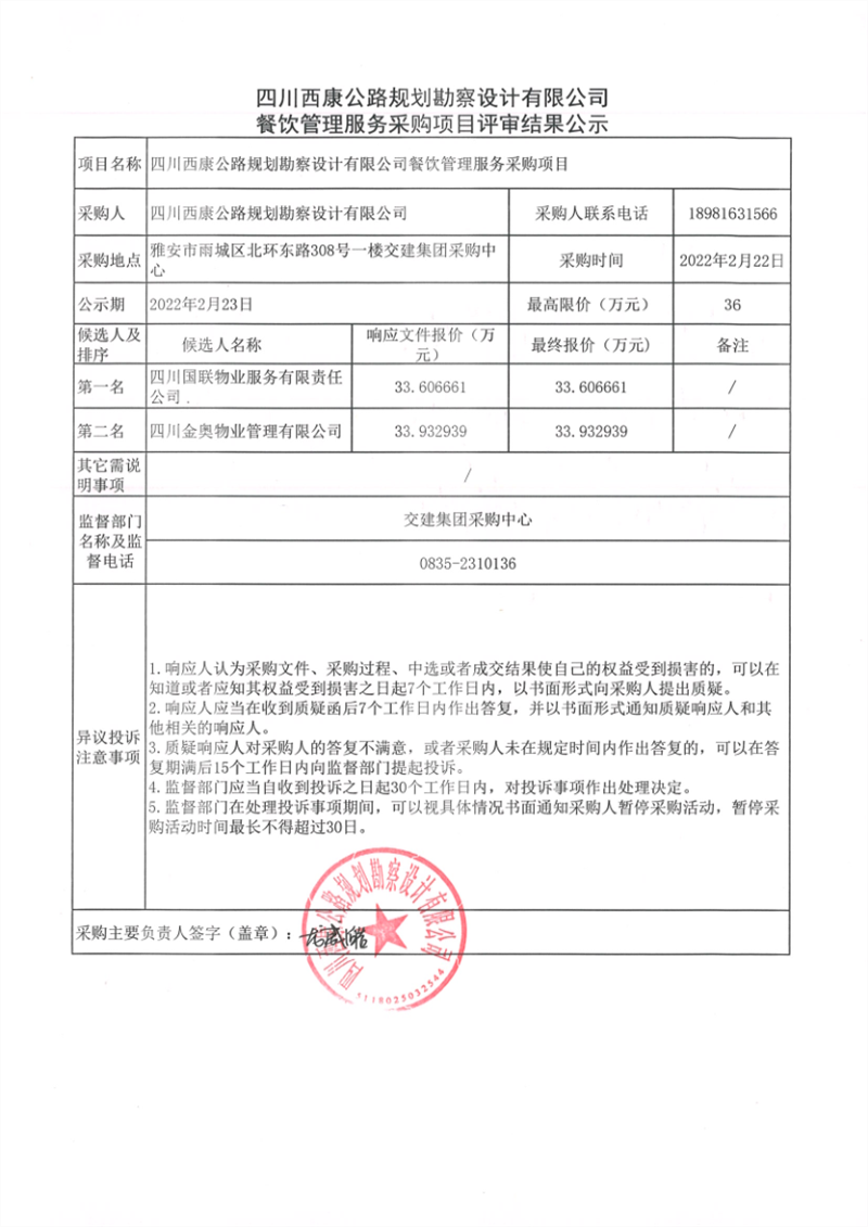 四川西康公路規(guī)劃勘察設計有限公司餐飲管理服務采購項目評審結(jié)果公示