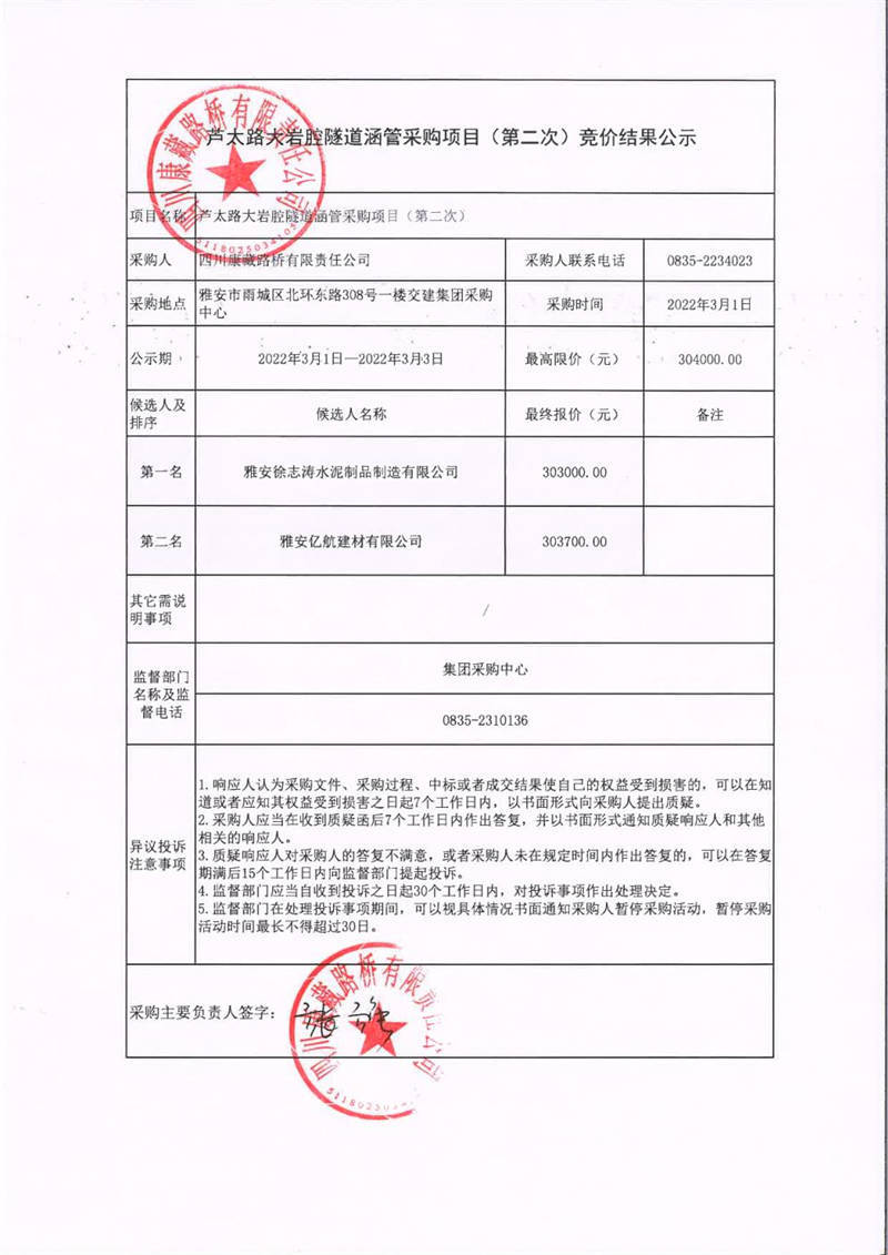 四川康藏路橋有限責(zé)任公司蘆太路大巖腔隧道涵管采購項(xiàng)目(第二次)競價結(jié)果公示