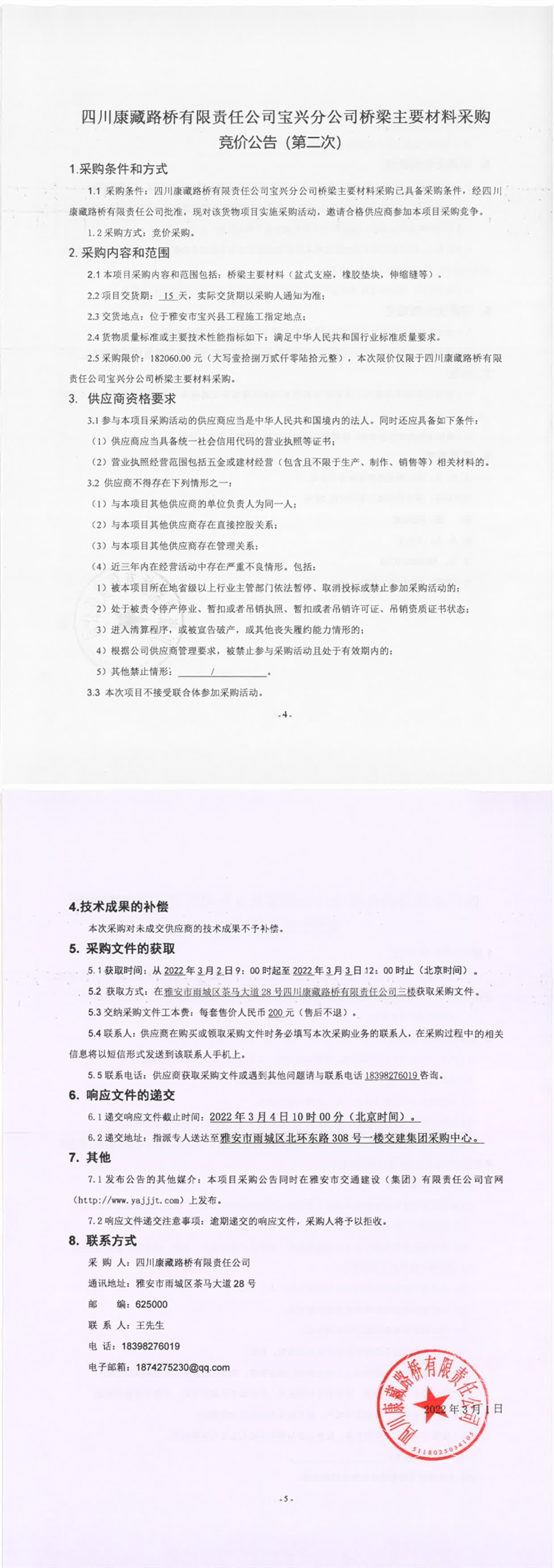四川康藏路橋有限責(zé)任公司寶興分公司橋梁主要材料采購(gòu)競(jìng)價(jià)公告(第二次)