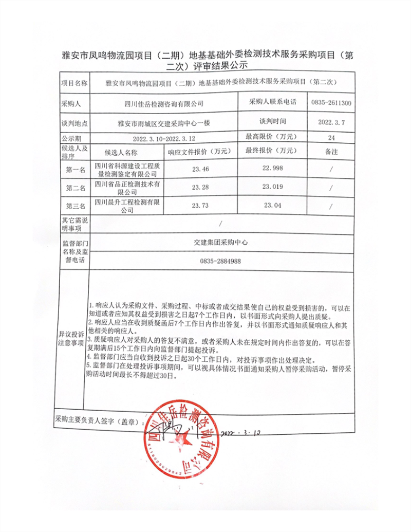 四川佳岳檢測咨詢有限公司雅安市鳳鳴物流園項目(二期)地基基礎外委檢測技術服務采購項目(第二次)評審結果公示