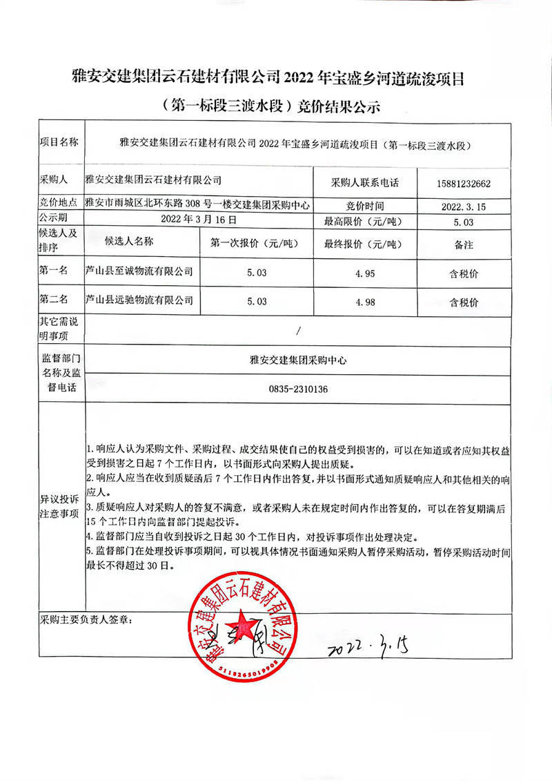 雅安交建集團云石建材有限公司2022年寶盛鄉(xiāng)河道疏浚項目(第二標段紙廠頭段)競價結(jié)果公示