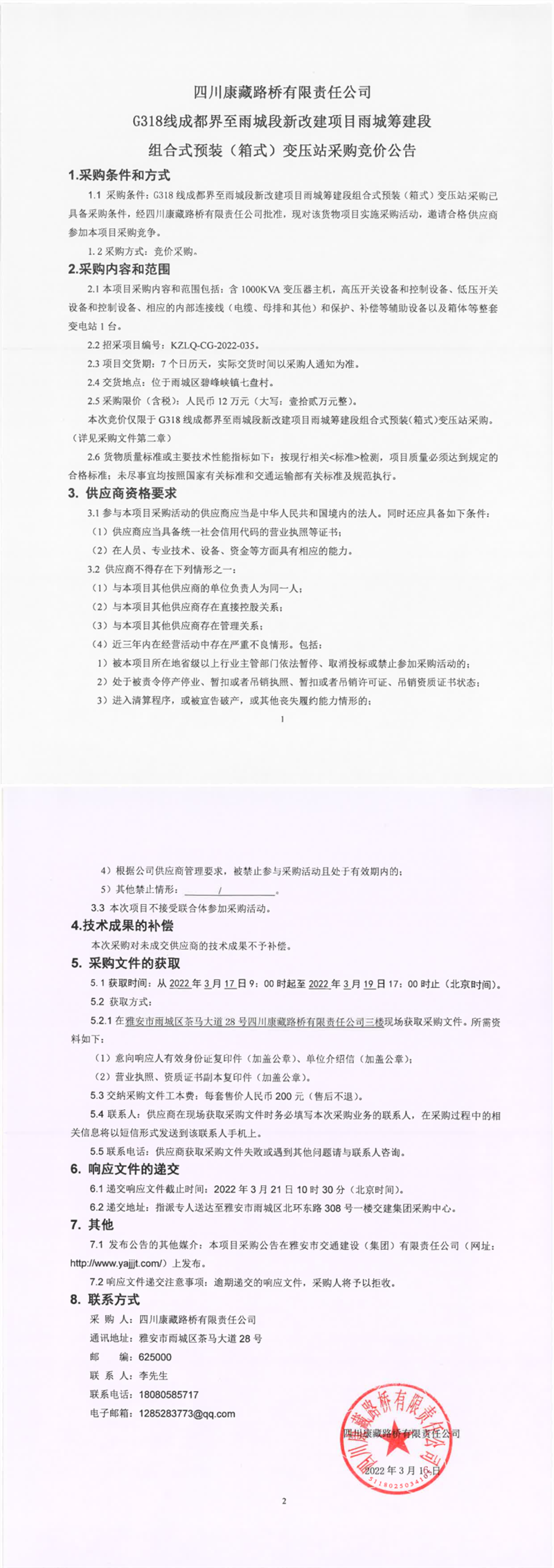 四川康藏路橋有限責(zé)任公司G318線成都界至雨城段新改建項(xiàng)目雨城籌建段組合式預(yù)裝(箱式)變壓站采購競(jìng)價(jià)公告