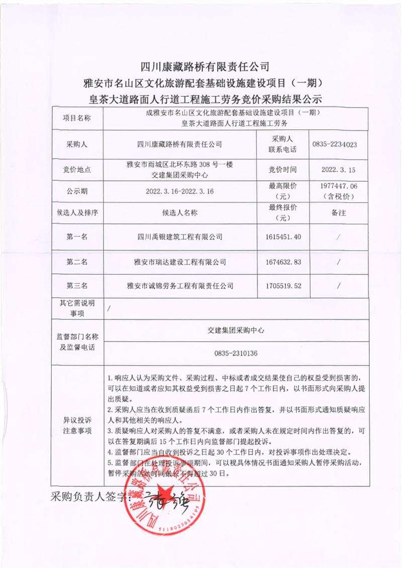 四川康藏路橋有限責(zé)任公司雅安市名山區(qū)文化旅游配套基礎(chǔ)設(shè)施建設(shè)項(xiàng)目(一期)皇茶大道路面人行道工程施工勞務(wù)競價采購結(jié)果公示