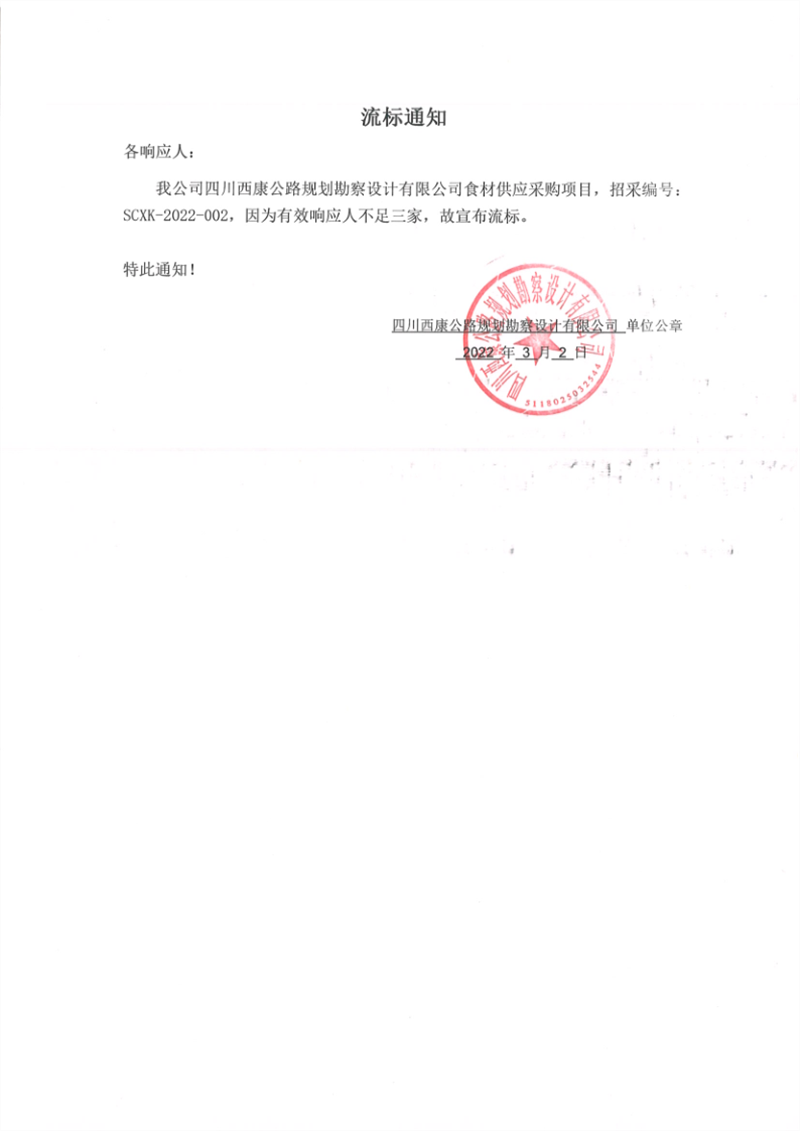 四川西康公路規(guī)劃勘察設(shè)計有限公司食材供應(yīng)采購項目流標(biāo)通知