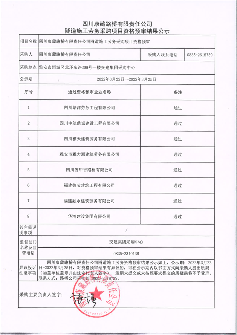 四川康藏路橋有限責(zé)任公司隧道施工勞務(wù)采購(gòu)項(xiàng)目資格預(yù)審結(jié)果公示