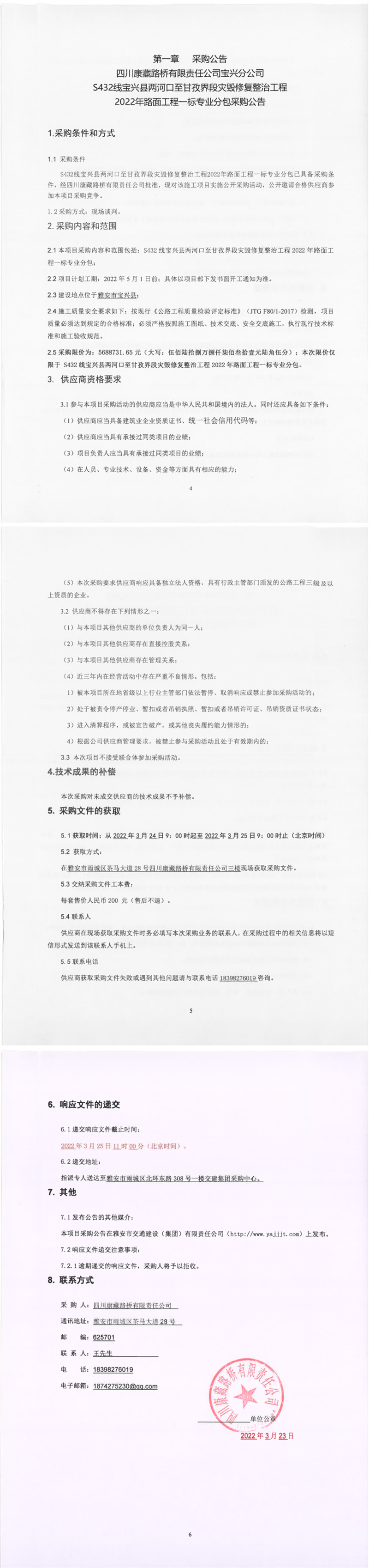 四川康藏路橋有限責(zé)任公司S432線寶興縣兩河口至甘孜界段災(zāi)毀修復(fù)整治工程2022年路面工程一標專業(yè)分包采購公告