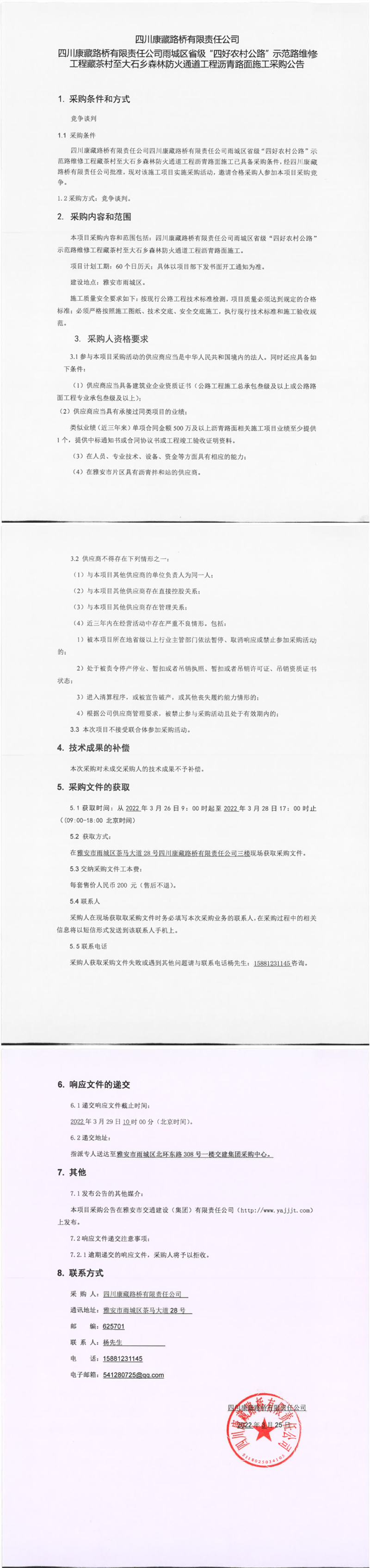 四川康藏路橋有限責(zé)任公司雨城區(qū)省級(jí)“四好農(nóng)村公路”示范路維修工程藏茶村至大石鄉(xiāng)森林防火通道工程瀝青路面施工采購公告
