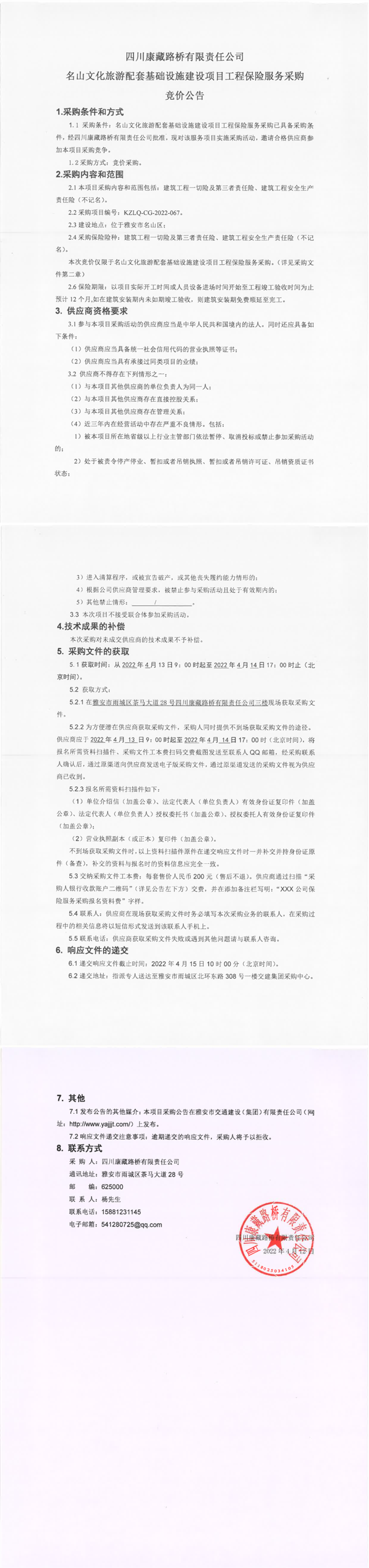 四川康藏路橋有限責(zé)任公司名山文化旅游配套基礎(chǔ)設(shè)施建設(shè)項(xiàng)目工程保險服務(wù)采購競價公告