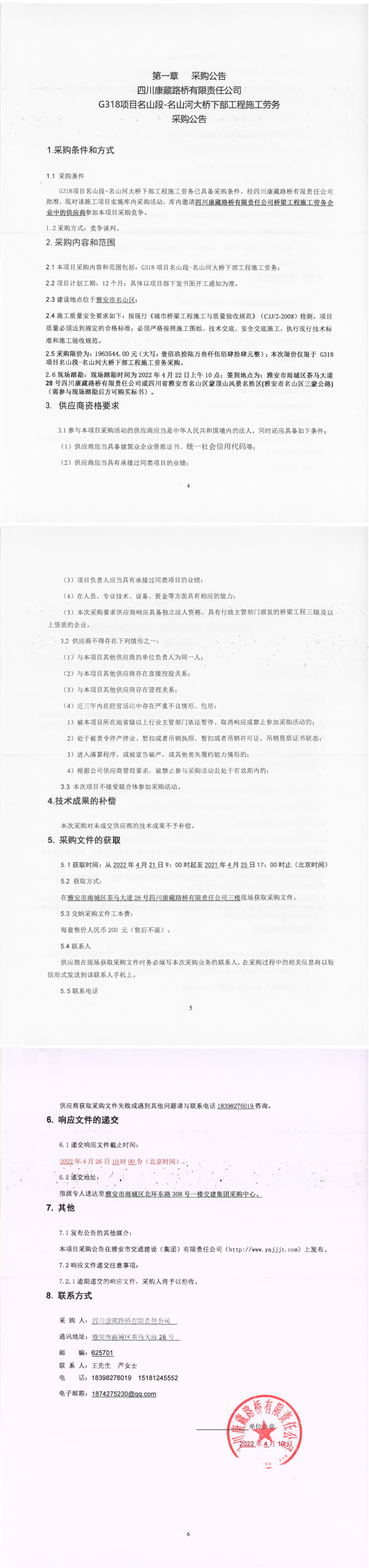 四川康藏路橋有限責任公司G318項目名山段-名山河大橋下部工程施工勞務采購公告