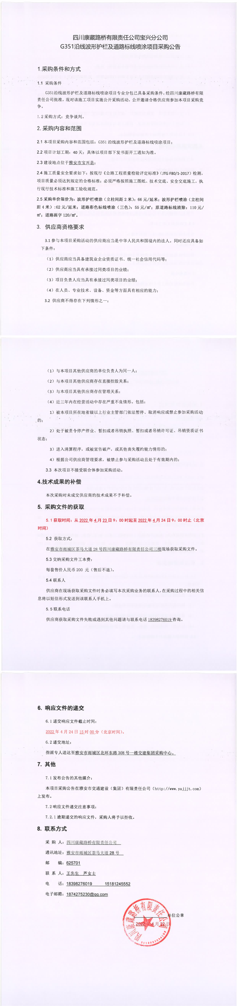 四川康藏路橋有限責任公司寶興分公司G351沿線波形護欄及道路標線噴涂項目采購公告