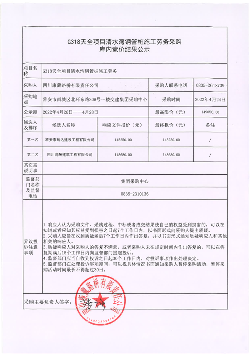 四川康藏路橋有限責(zé)任公司G318天全項(xiàng)目清水灣鋼管樁施工勞務(wù)采購庫內(nèi)競價(jià)結(jié)果公示