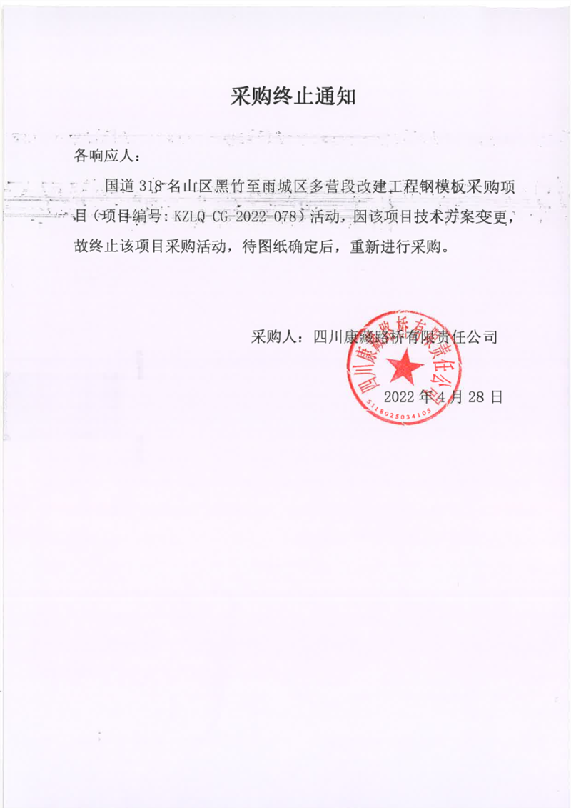 四川康藏路橋有限責(zé)任公司國(guó)道318名山區(qū)黑竹至雨城區(qū)多營(yíng)段改建工程鋼模板采購(gòu)終止通知