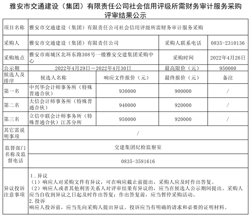 雅安市交通建設(shè)(集團)有限責任公司社會信用評級所需財務(wù)審計服務(wù)采購評審結(jié)果公示