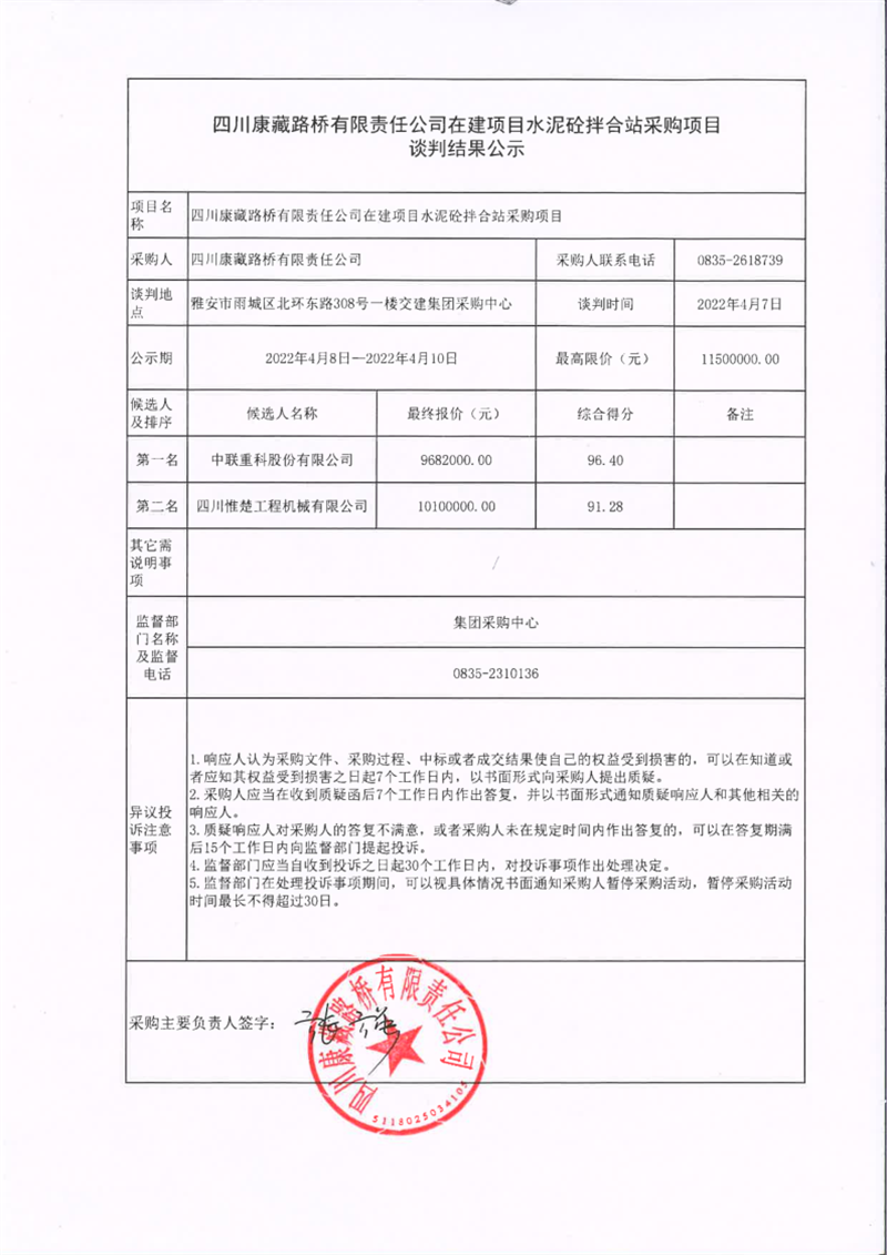 四川康藏路橋有限責(zé)任公司在建項(xiàng)目水泥砼拌合站采購項(xiàng)目談判結(jié)果公示