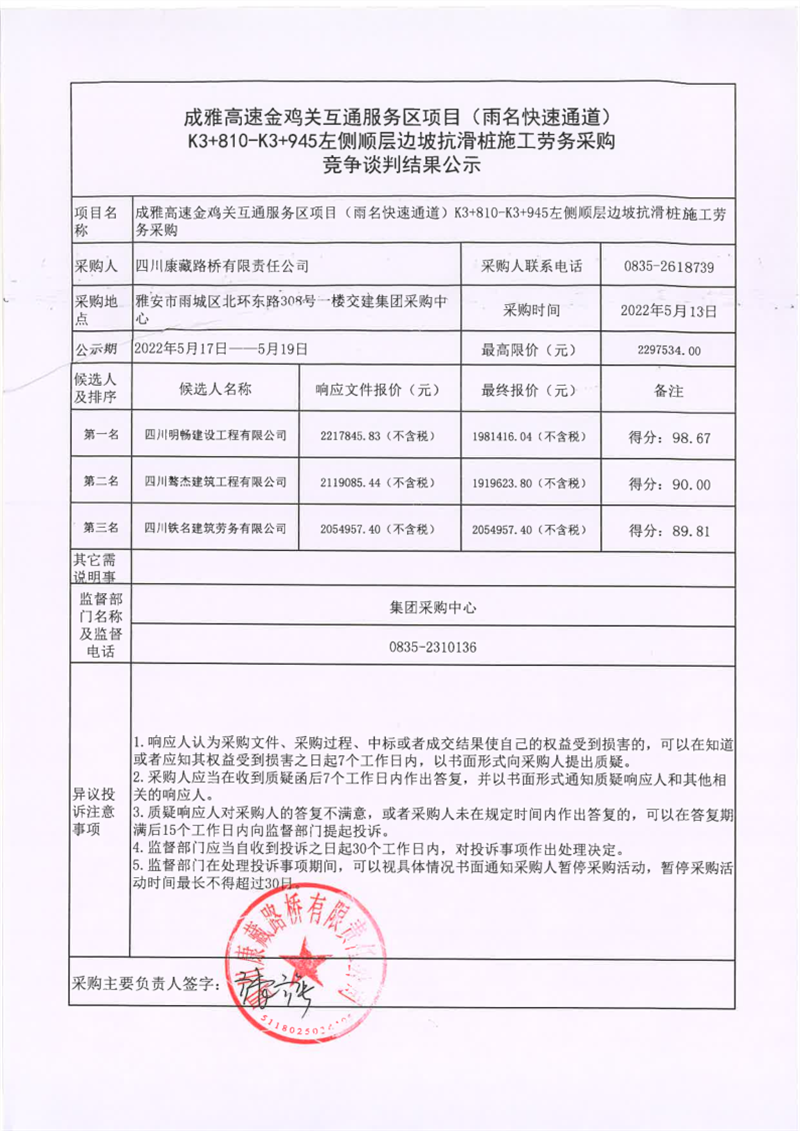 四川康藏路橋有限責任公司成雅高速金雞關互通服務區(qū)項目(雨名快速通道)K3+810-K3+945左側順層邊坡抗滑樁施工勞務采購競爭談判結果公示