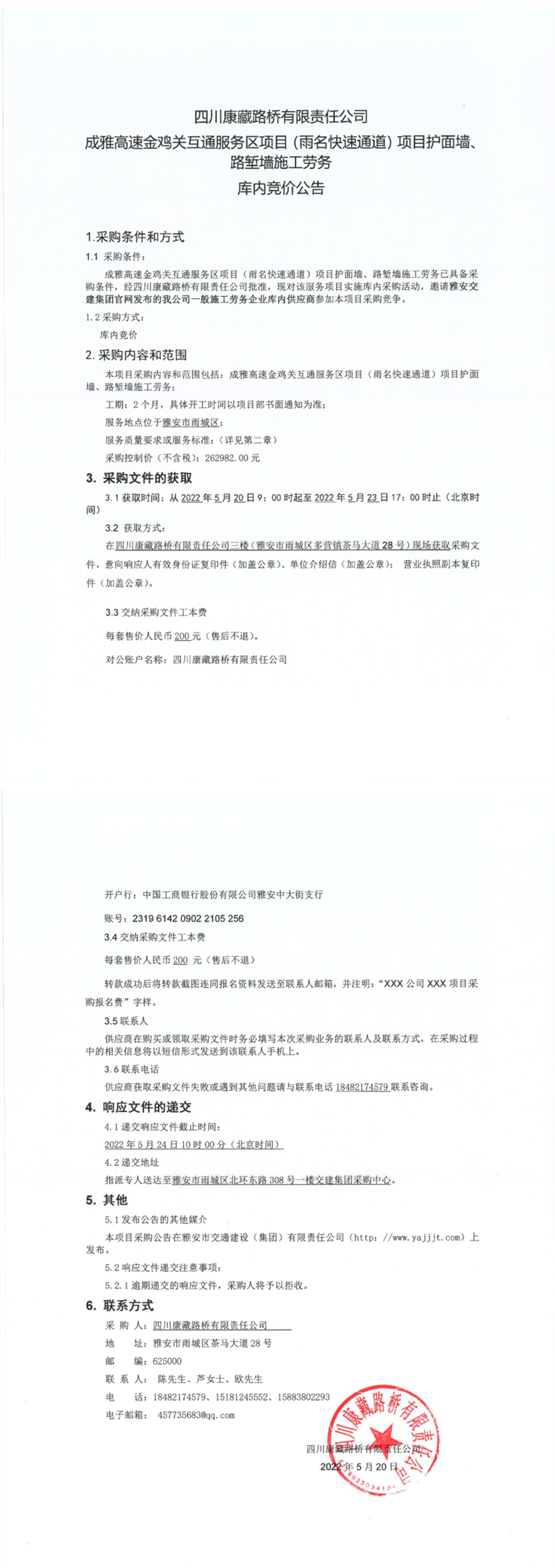 四川康藏路橋有限責(zé)任公司成雅高速金雞關(guān)互通服務(wù)區(qū)項目(雨名快速通道)項目護(hù)面墻、路塹墻施工勞務(wù)庫內(nèi)競價公告