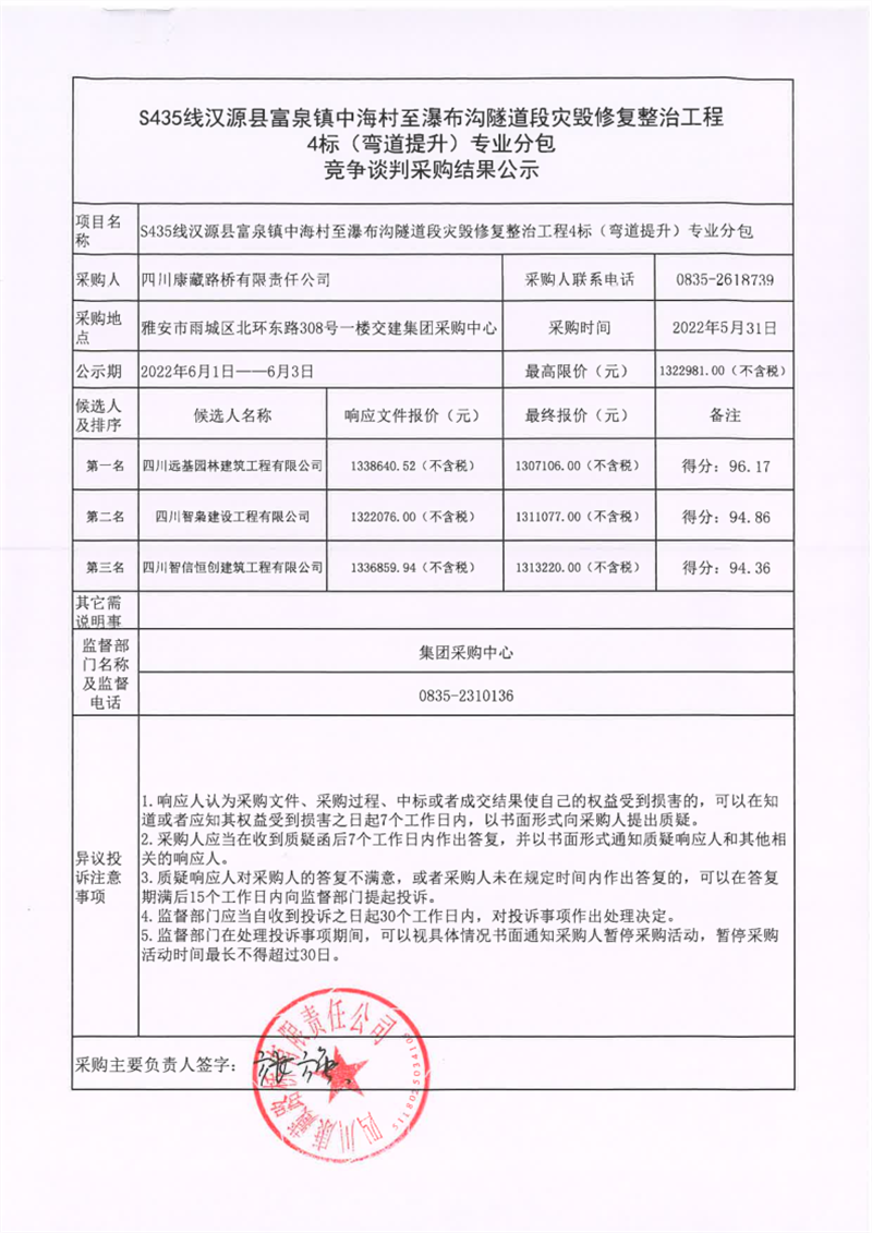 四川康藏路橋有限責任公司S435線漢源縣富泉鎮(zhèn)中海村至瀑布溝隧道段災毀修復整治工程4標(彎道提升)專業(yè)分包競爭談判采購結(jié)果公示