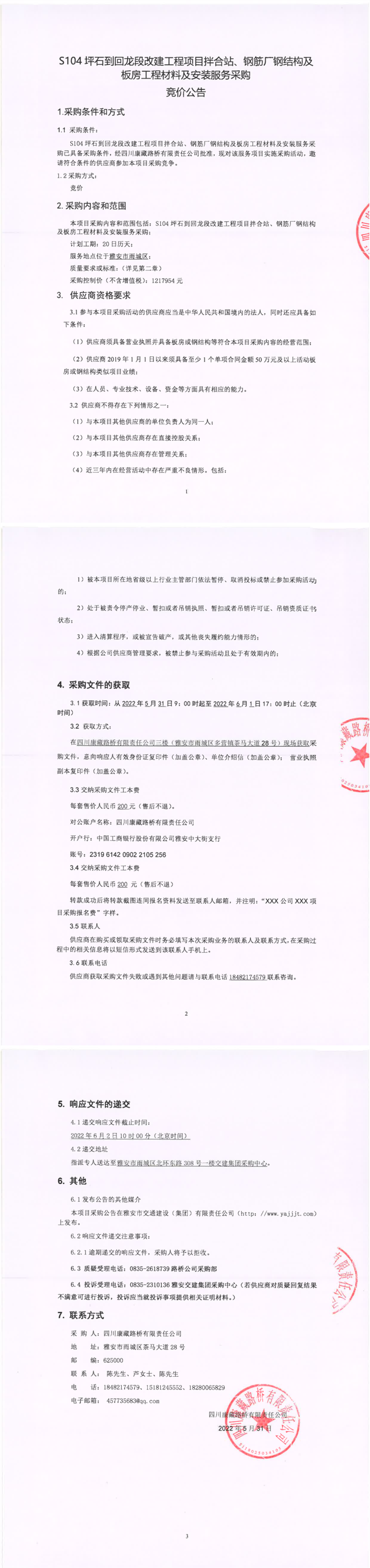 四川康藏路橋有限責(zé)任公司S104坪石到回龍段改建工程項(xiàng)目拌合站、鋼筋廠鋼結(jié)構(gòu)及板房工程材料及安裝服務(wù)采購競價(jià)公告