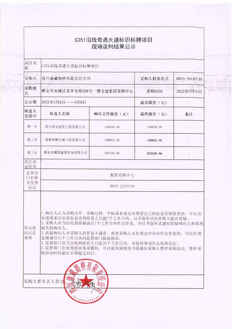 四川康藏路橋有限責(zé)任公司G351沿線奇遇大道標(biāo)識標(biāo)牌項目現(xiàn)場談判結(jié)果公示