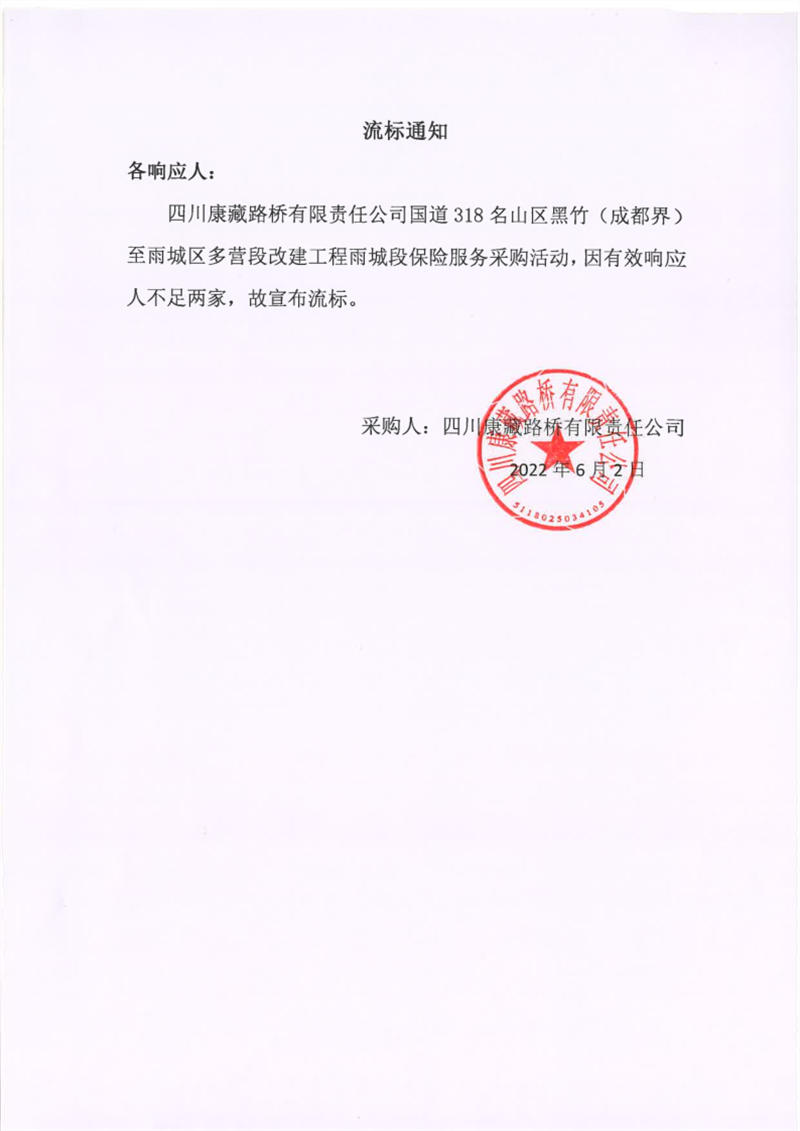 四川康藏路橋有限責(zé)任公司國道318名山區(qū)黑竹(成都界)至雨城區(qū)多營段改建工程雨城段保險(xiǎn)服務(wù)采購流標(biāo)通知