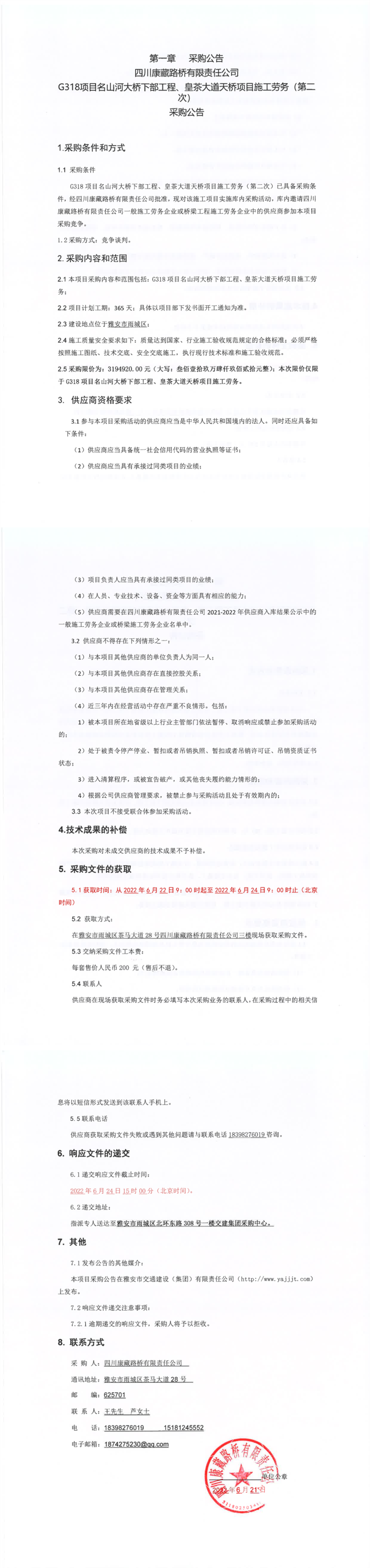 四川康藏路橋有限責任公司G318項目名山河大橋下部工程、皇茶大道天橋項目施工勞務(wù)(第二次)采購公告