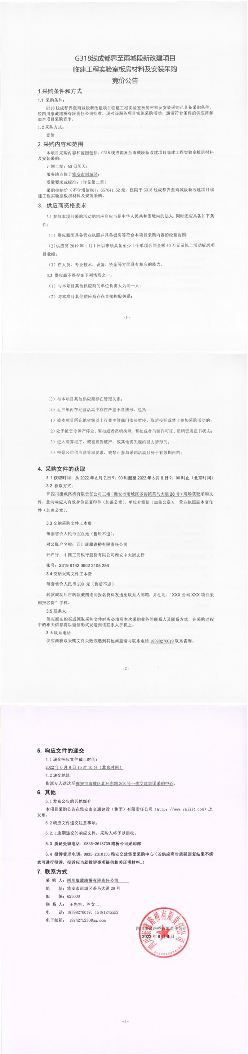 四川康藏路橋有限責(zé)任公司G318線(xiàn)成都界至雨城段新改建項(xiàng)目臨建工程實(shí)驗(yàn)室板房材料及安裝采購(gòu)競(jìng)價(jià)公告