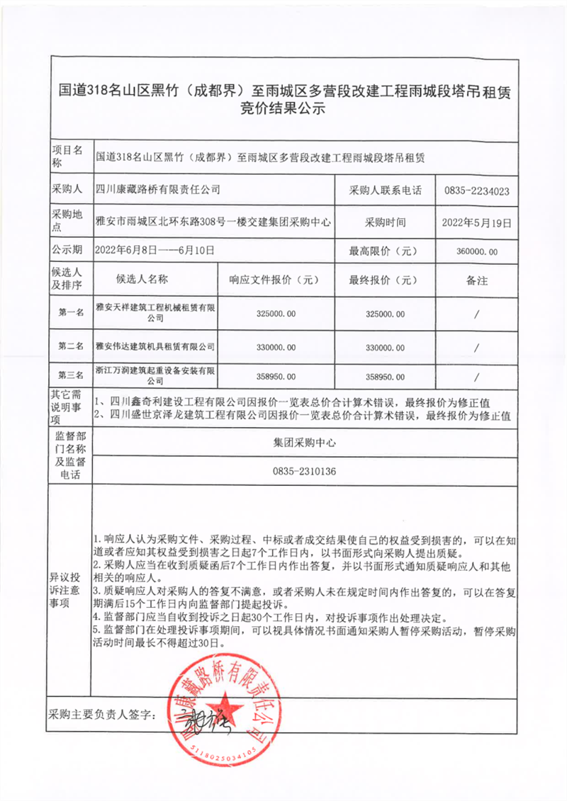 四川康藏路橋有限責(zé)任公司國道318名山區(qū)黑竹(成都界)至雨城區(qū)多營段改建工程雨城段塔吊租賃競價(jià)結(jié)果公示
