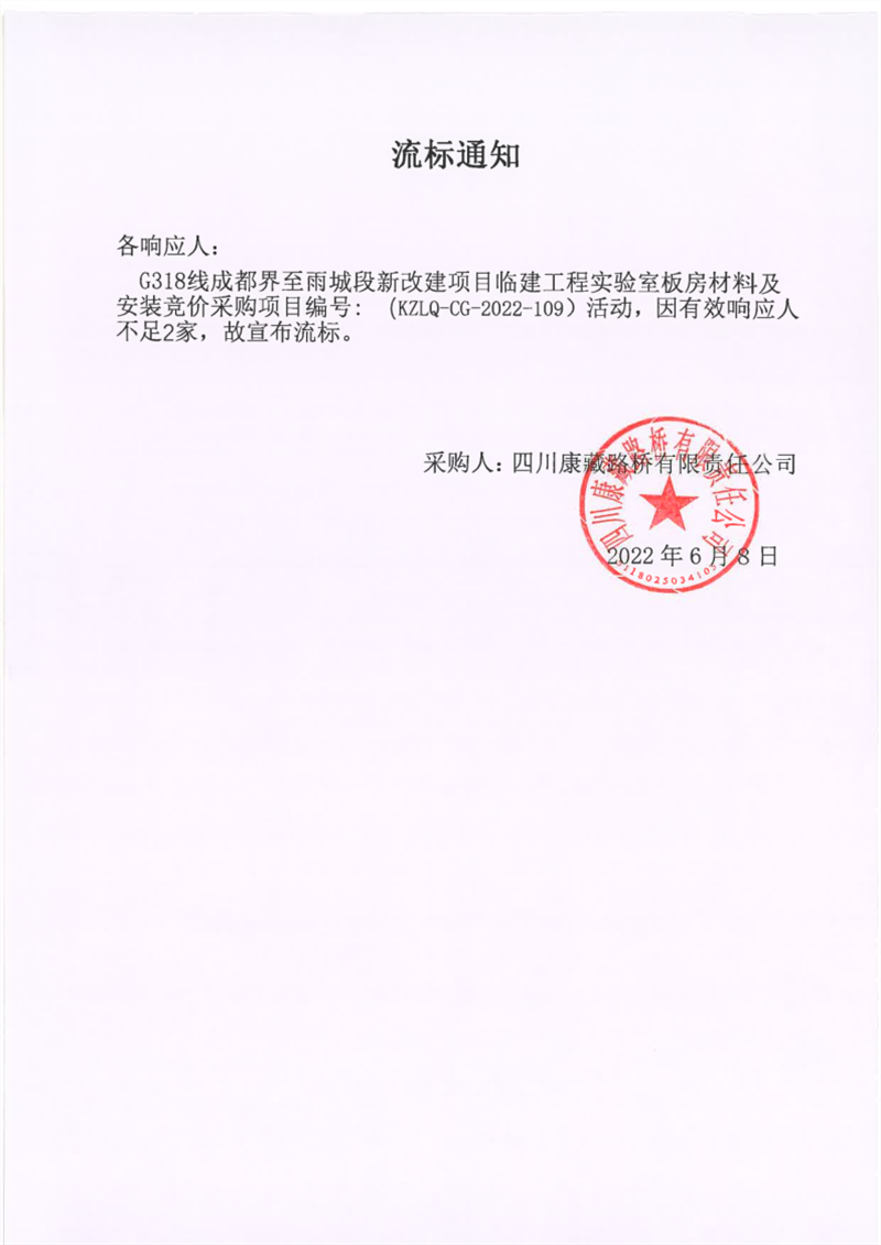 四川康藏路橋有限責(zé)任公司G318線成都界至雨城段新改建項(xiàng)目臨建工程實(shí)驗(yàn)室板房材料及安裝采購(gòu)流標(biāo)通知