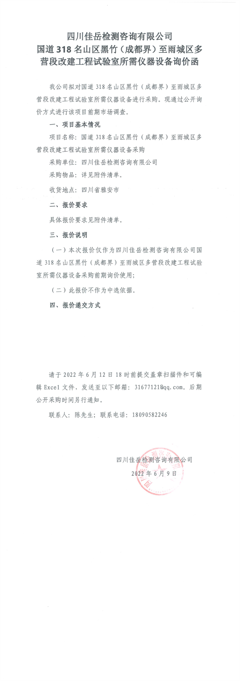 四川佳岳檢測(cè)咨詢有限公司國道318名山區(qū)黑竹(成都界)至雨城區(qū)多營段改建工程試驗(yàn)室所需儀器設(shè)備詢價(jià)函