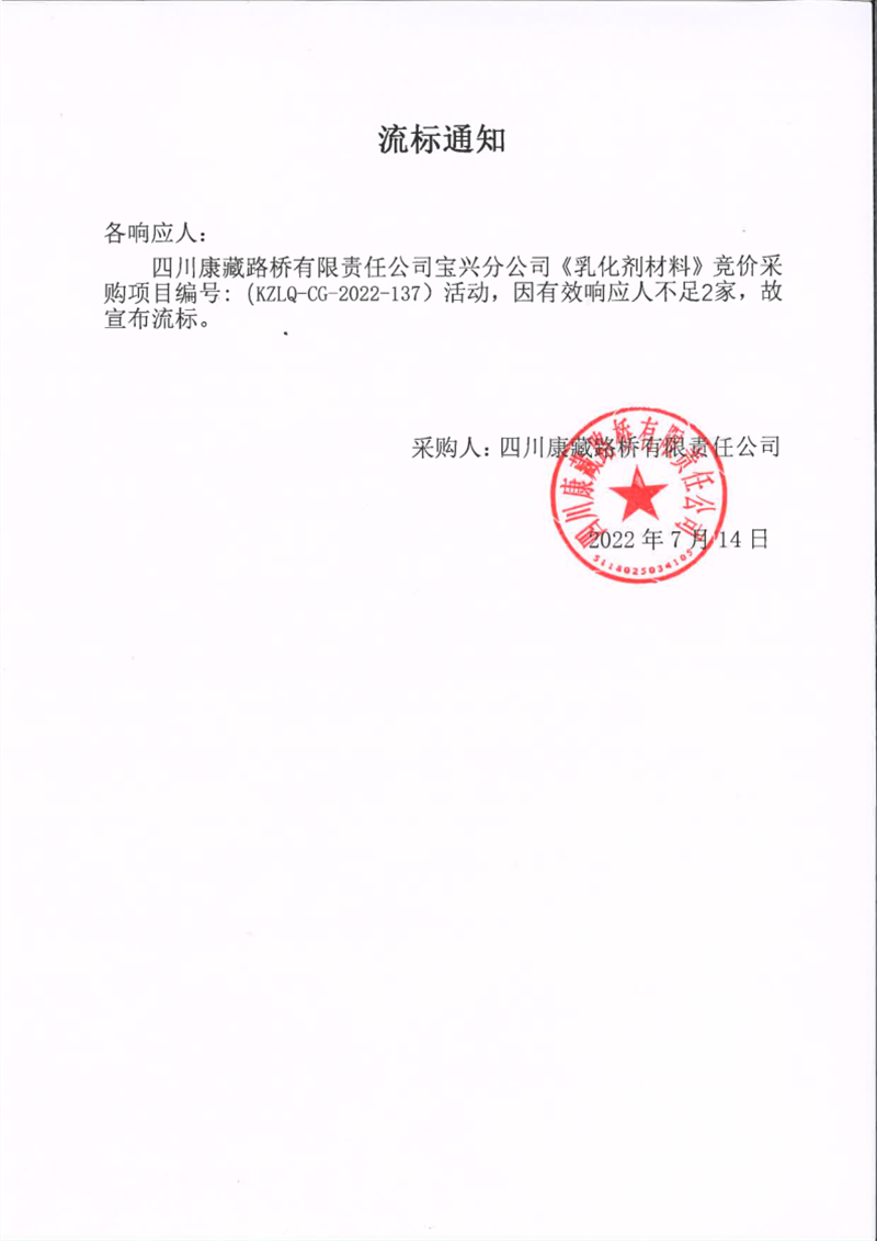 四川康藏路橋有限責(zé)任公司寶興分公司乳化劑材料采購流標通知