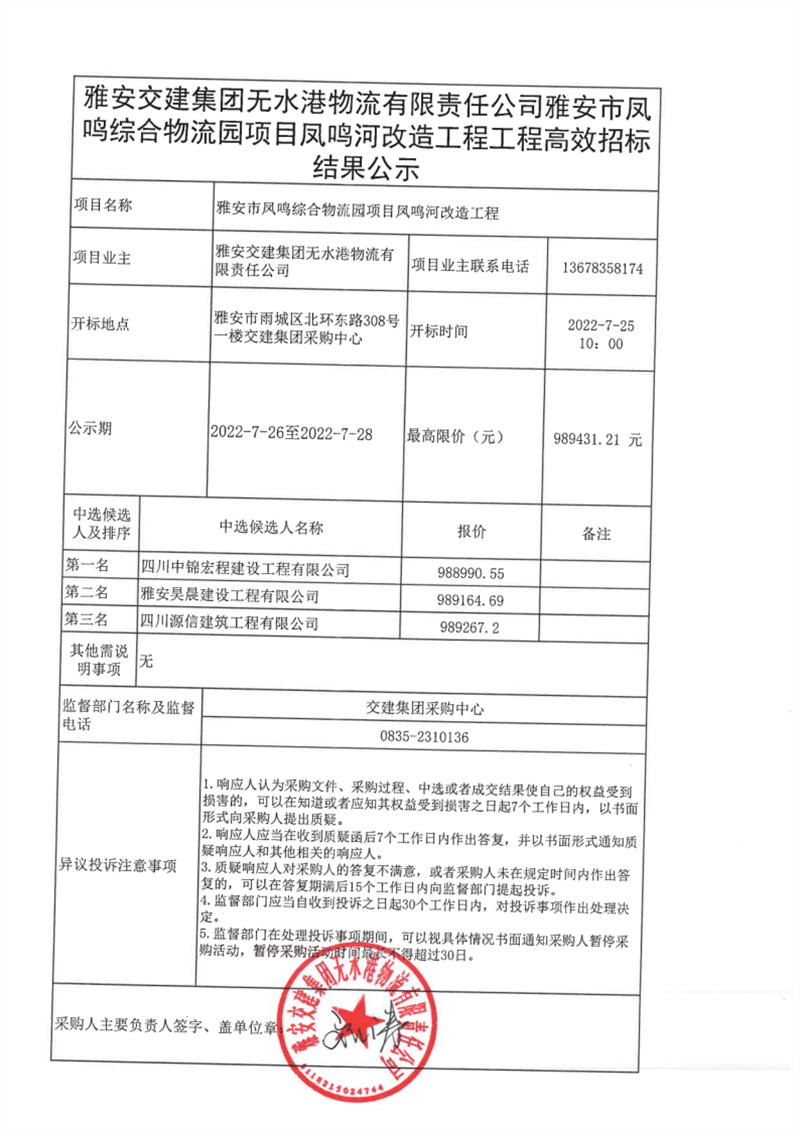 雅安交建集團(tuán)無水港物流有限責(zé)任公司雅安市鳳鳴綜合物流園鳳鳴河改造工程工程高效招標(biāo)結(jié)果公示