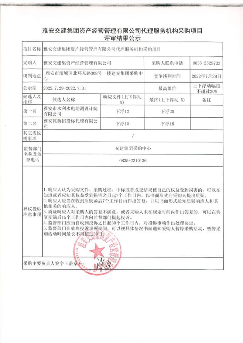 雅安交建集團資產經營管理有限公司代理服務機構采購項目評審結果公示