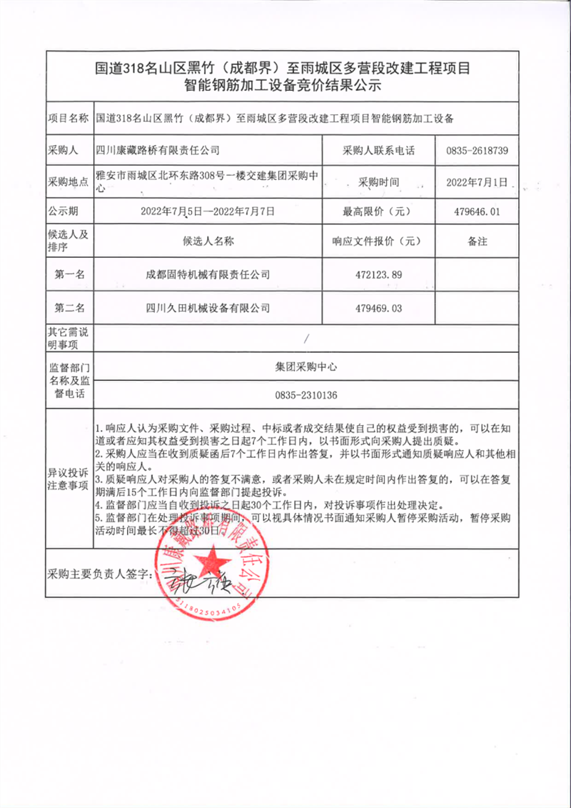 四川康藏路橋有限責(zé)任公司國(guó)道318名山區(qū)黑竹(成都界)至雨城區(qū)多營(yíng)段改建工程智能鋼筋加工設(shè)備競(jìng)價(jià)結(jié)果公示