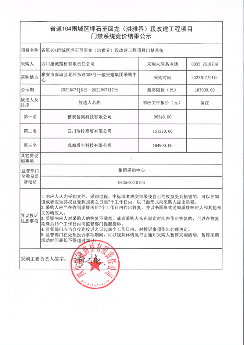四川康藏路橋有限責任公司省道104雨城區(qū)坪石至回龍(洪雅界)段改建工程門禁系統(tǒng)競價結(jié)果公示