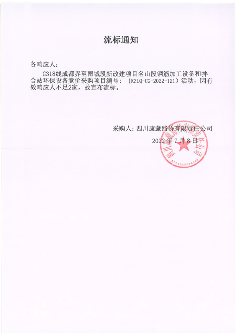 四川康藏路橋有限責(zé)任公司G318線成都界至雨城段新改建項(xiàng)目名山段鋼筋加工設(shè)備和拌合站環(huán)保設(shè)備競(jìng)價(jià)采購(gòu)項(xiàng)目流標(biāo)通知
