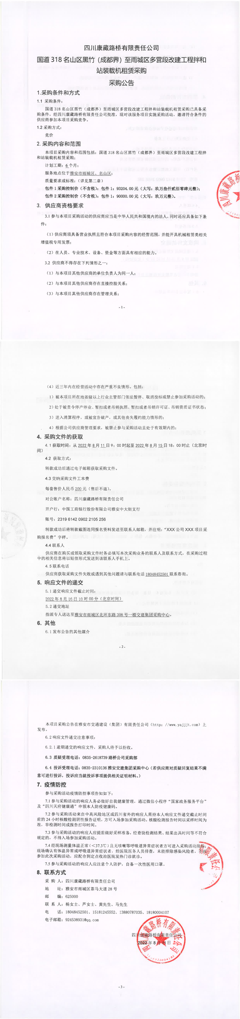 四川康藏路橋有限責(zé)任公司國道318名山區(qū)黑竹(成都界)至雨城區(qū)多營段改建工程拌和站裝載機(jī)租賃采購公告