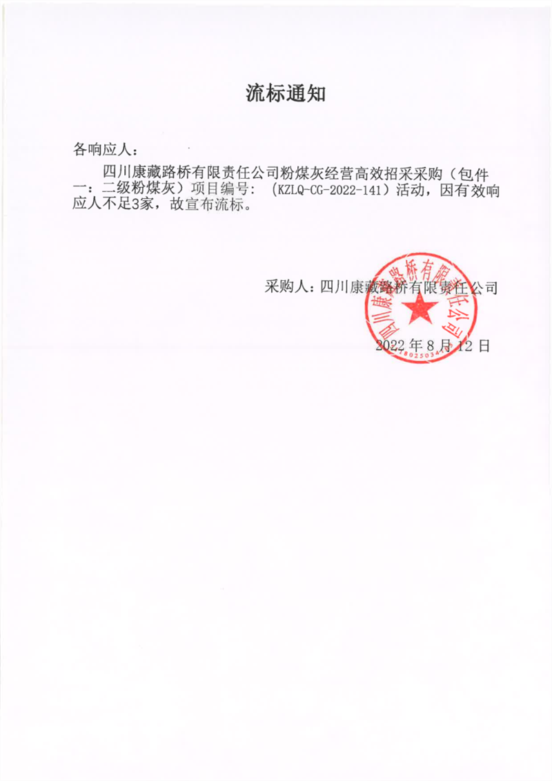 四川康藏路橋有限責任公司粉煤灰經(jīng)營高效招采采購(包件一:二級粉煤灰)流標通知